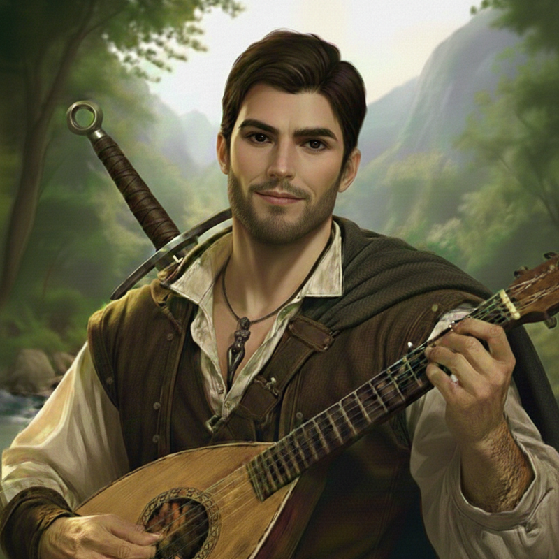 Sans grand talent musical, il rêve cependant de devenir riche et célèbre grâce à son art. Même si sa musique ne convient pas vraiment à la cour des plus grands elle est très appréciée dans les tavernes. Il gagne sa vie en faisant des petits boulots et en utilisant son bagou et sa grande beauté pour influencer les gens en sa faveur et avoir à travailler le moins possible.
