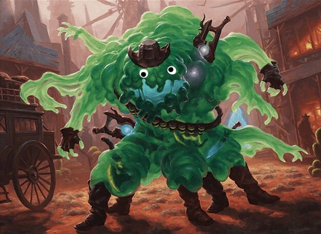 Une boule de blob vert géant (un peu plus de 2 mètres) et conscient, capable de modifier sa forme si besoin. Une énergie débordante (littéralement - des morceaux de slime se décrochent quand tout ça bouge), un tempérament assez explosif et une passion étonnante pour les films de cowboy.