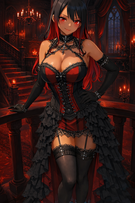 Remarquable par ses longs cheveux noirs à mèche rouge, de grands yeux rouges et sa stature, elle mesure, après tout ,1,93 m.