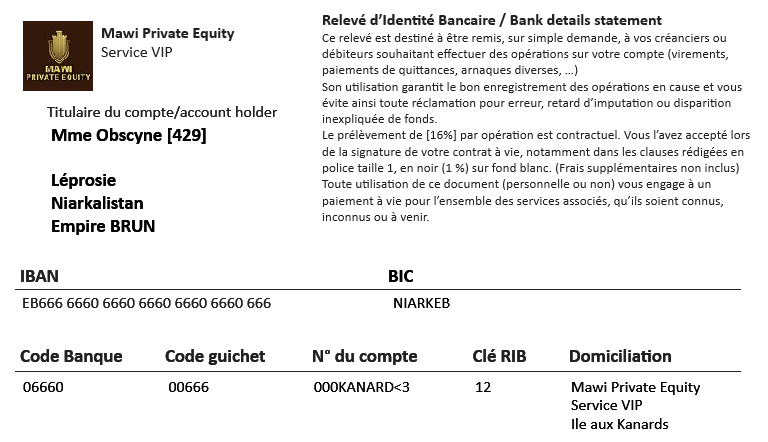 - Licence de diffusion pour dix ans de contenus cinématographiques payants sur le territoire BRUN à destination des citoyens BRUNS : 20 000 MØ payable directement en une fois sur le site du ministère BRUN de l'économie.