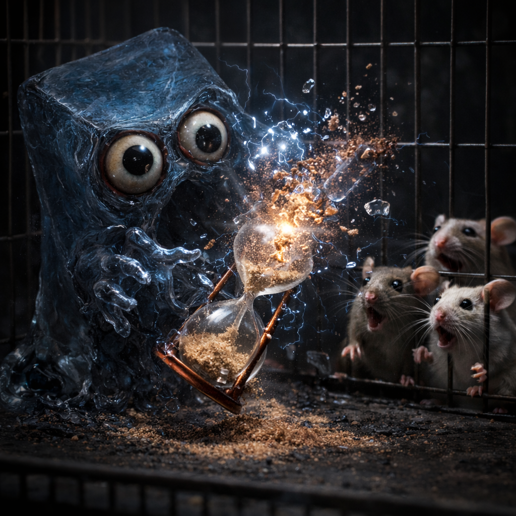 AprÚs consommation de logique brute, les souris sont partis se réfugier dans leur cage avant de se figer, le sablier a effectivement ralentis son écoulement puis a subitement explosé.Spoiler