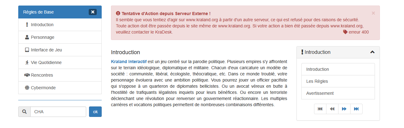 Je viens de m’apercevoir d'une restriction lors de la soumission du formulaire des règles. Au début, j'ai pas compris parce que deux autres joueurs ne reproduisaient pas le problème. J'ai tapé CHA dans le filtre de recherche des règles et je suis tombé sur cette erreur. J'ai réalisé après coup que mon navigateur était en navigation privé et non connecté à mon compte. A priori, soumettre ce formulaire sans session trigger une sécurité. Je me suis connecté normalement et le message n'était pas présent.