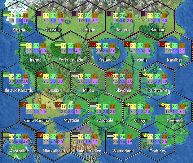 Certains l'ont deviné de part la forme un peu "écrasée" vers la droite et le nombre de provinces, nous démarrerons avec 6 empires, et chacun possédera 4 provinces et 5 villes. Il y aura donc un peu plus de provinces que sur l'actuel plateau, mais beaucoup moins de villes.