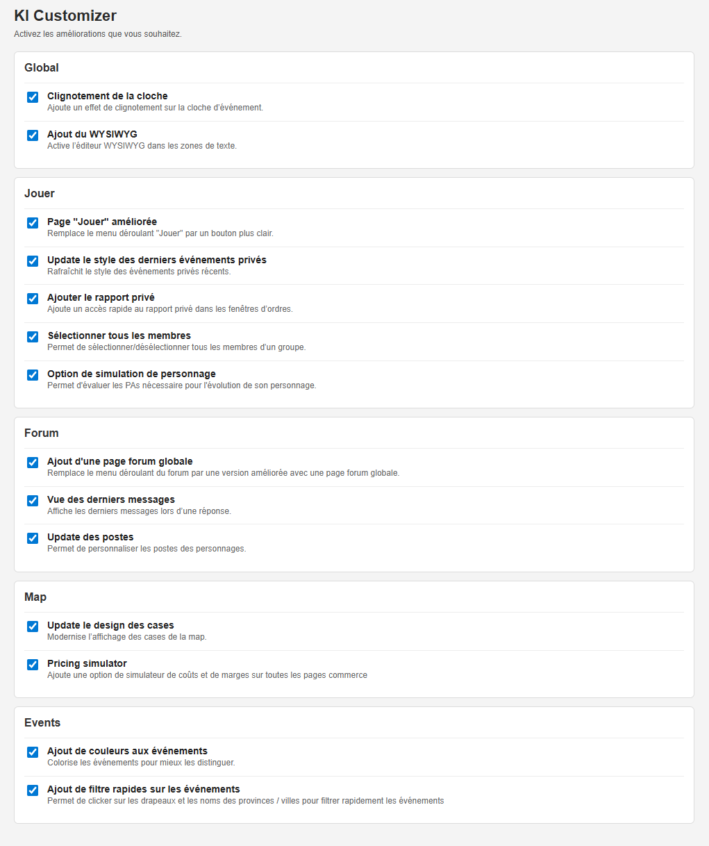 Les options sont regroupées en fonction des pages qu'elles impactent, voici un bref explicatif.