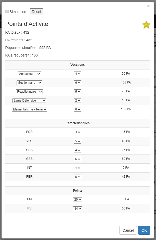 Update le design de la page à laquelle vous accédez quand vous cliquez sur l'étoile à côté de votre avatar dans la partie personnage de la page plateau. Vous avez accès à une option de simulation qui vous permet de bouger les valeurs des vocations, caractéristiques, PM et PV et vous indique le nombre total de PAs nécessaires et le nombre de PAs qu'il vous reste à gagner pour arriver au build.