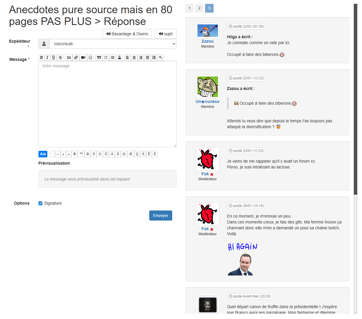 Changement de la page quand vous cliquer sur répondre dans un sujet. Vous pouvez naviguer dans toutes les pages du sujet auquel vous répondez dans la partie droite de la page.