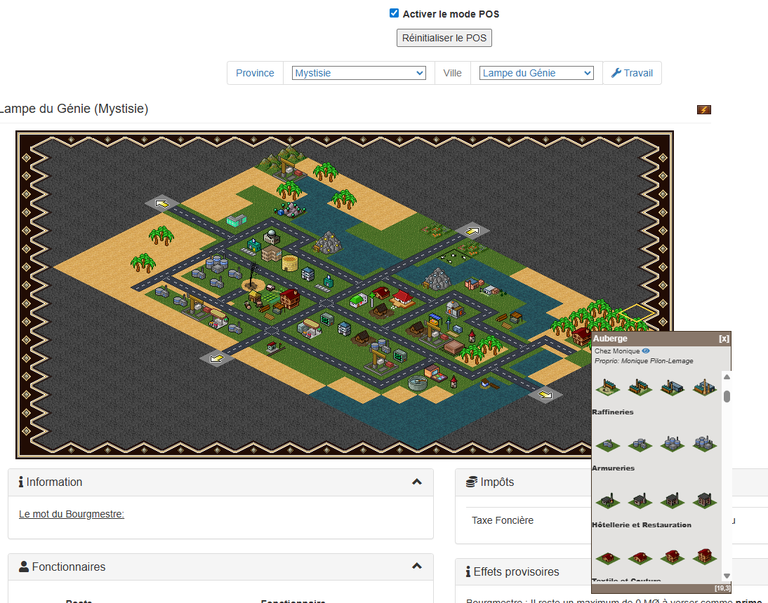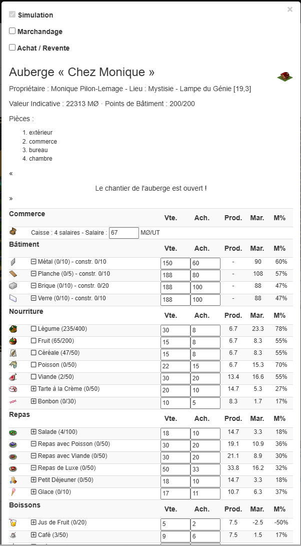 Depuis la page carte, pour chaque bâtiment, permet d'accéder à des options de simulation qui vous donne le prix de production des objets et la marge effectuée au vu des prix pratiqués. Vous pouvez tester de nouveaux prix d'achat/vente.