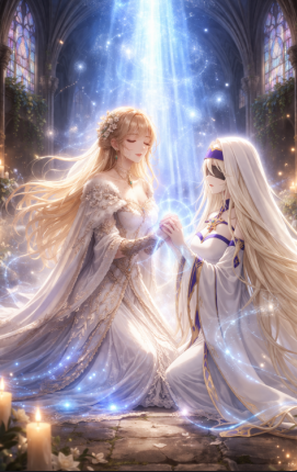 Un halo pâle bleu naissant autour des mains jointes des deux femmes, se déployant en une brume lumineuse subtile qui scintille doucement, au rythme de leur battement de coeur à l'unisson.
