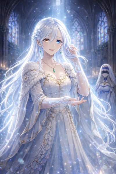 Ses cheveux blancs, du blanc pur de la neige fraîche sur les plaines de Sibéria, sont traversés de reflets bleutés qui gardent la lumière en eux tel un fragment de ciel qui s'est couché entre ses mèches délicates.