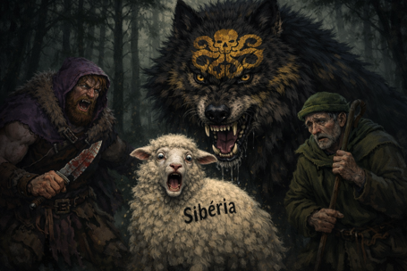 Voyez sur cette toile comme le vieux fermier paradigmien est incapable de protéger son brave mouton Sibérien du puissant et sauvage guerrier Elmerien. Le loup brun arrive heureusement à temps et on ne peut que déduire qu'il va sauver le mouton !