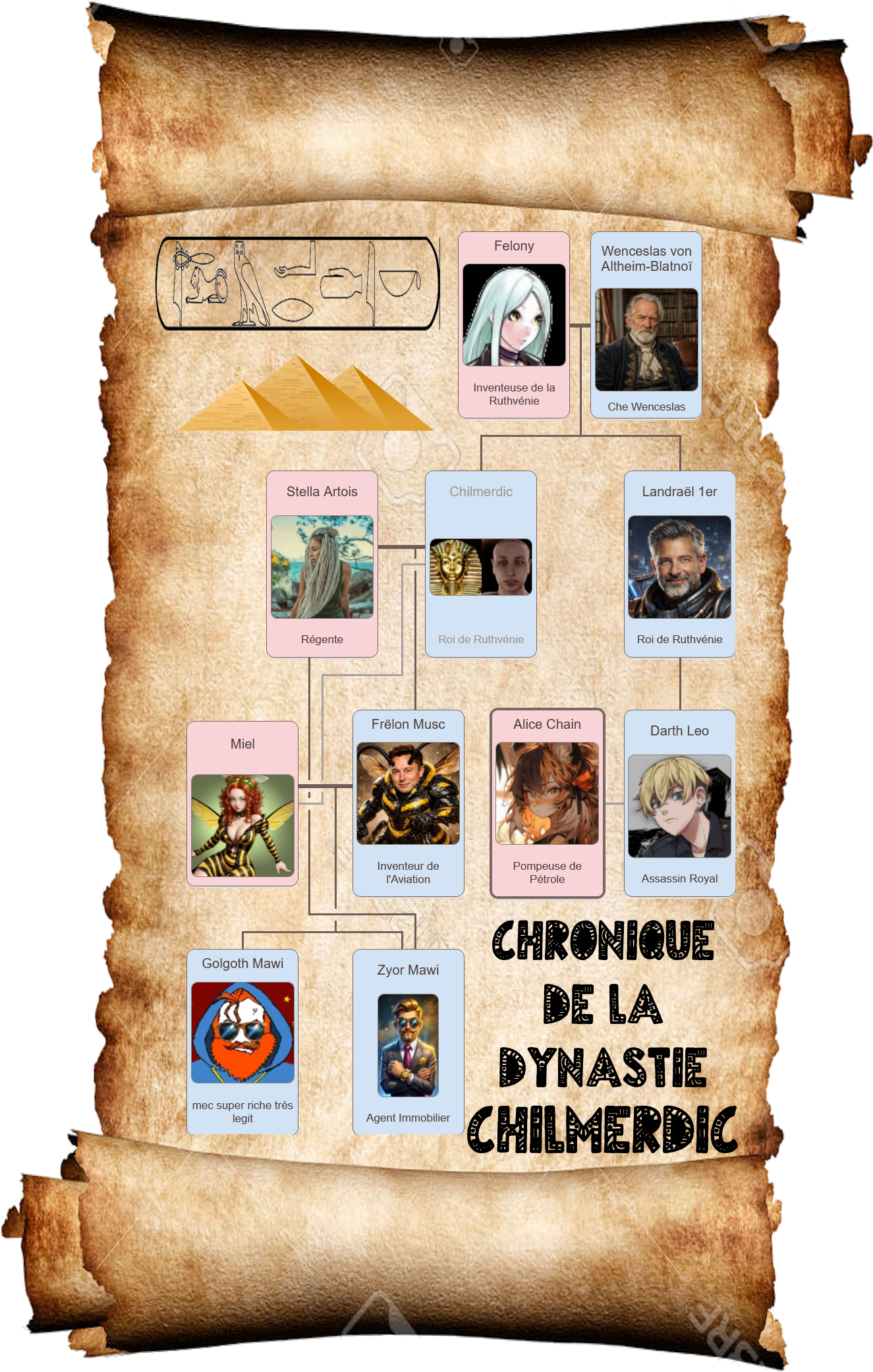 Je comprends aussi pourquoi Landraël refuse de nous parler de son lignage : il voulait pas admettre que son papa c'est Wenceslas. Tout fait sens petit à petit. Ca en fait mon grand-oncle. Logique. Et il a donc donné naissance à Darth Leo sans avoir recours à une mère, par mitose probablement. Ca ferait de Landraël un Bishônen alors ?![[o(]](http://img7.kraland.org/s/30.gif)
