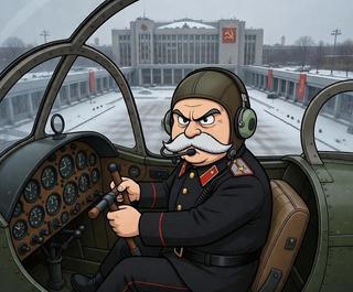 * L'Alerte générale raisonne dans les couloirs des services secrets Kralandais. Grøbatchev se précipite avec sa moustache sur la piste de décollage et monte à bord de son coléoptère de combat *