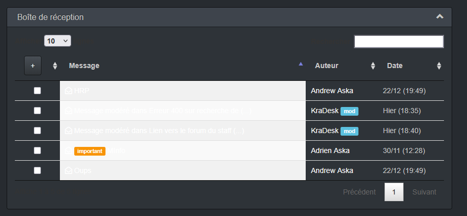 En utilisant le thème sombre, on a un problème de lisibilité si on trie les éléments d'un tableau (ici l'interface des Kramails) :