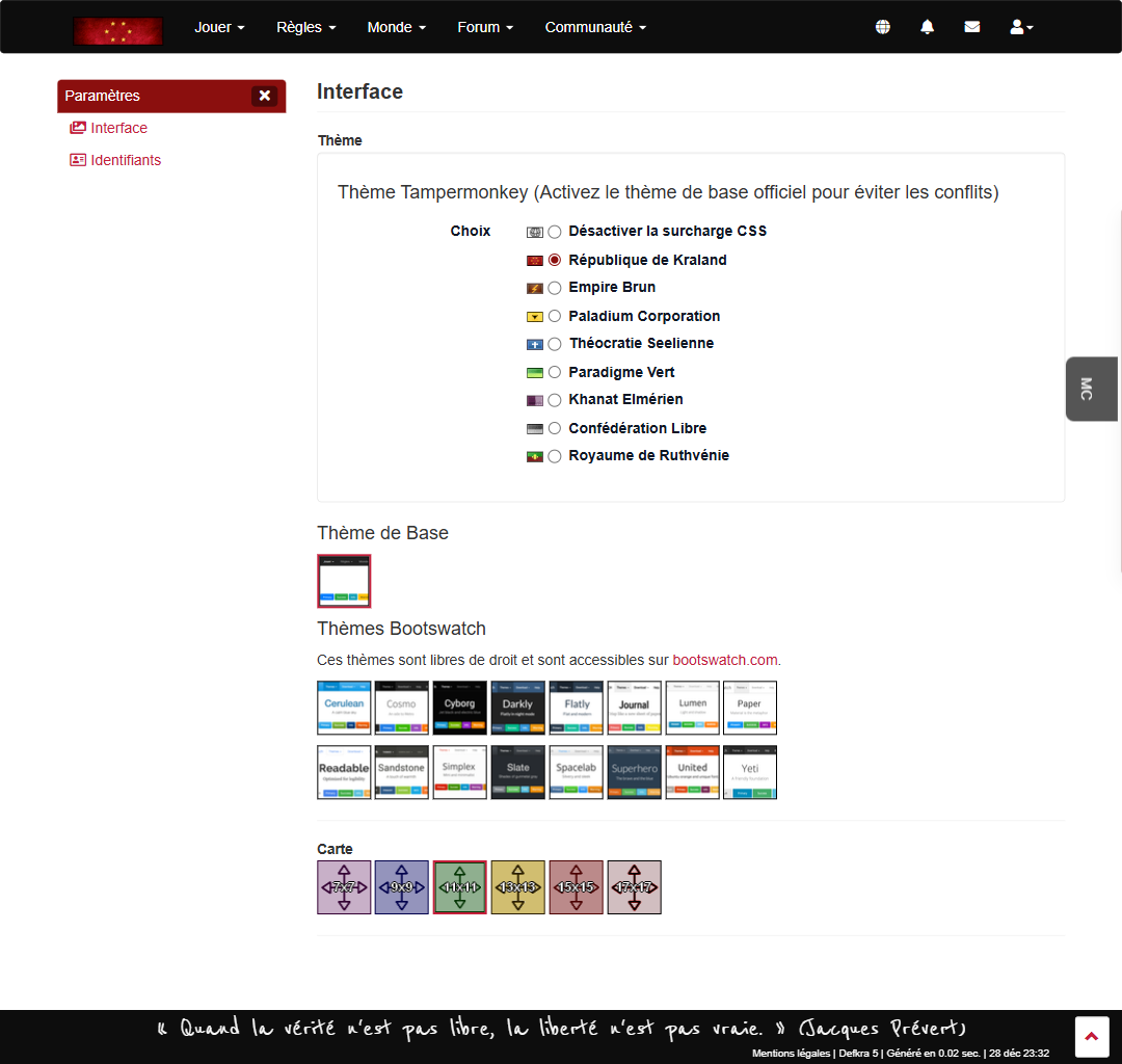 J'ai créé un userscript (Tampermonkey) qui surcharge l'interface de Kraland pour changer le CSS et corriger plusieurs petits problèmes d'affichage et d'accessibilité. Il s'applique côté client, permet de choisir plusieurs variantes de thème, améliore la navigation et apporte quelques ajustements DOM utiles.