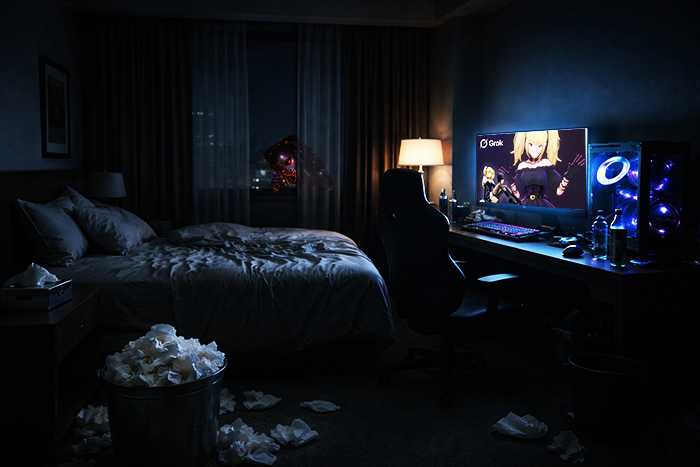 "Dès 14h du matin, une réunion de crise avec soi-même est réalisé avec Floran, un moment d'intimité aussi émouvant que sa couette est moite de samasturbation sur des bimbos gothiques générés par IAréflexion de la veille ! Imaginant les gens comme des documentaires animaliers, il croit être au dessus de la masse, se pensant comme supérieur alors qu'il est sujet aux mêmes effets que nous."