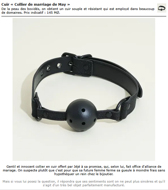 | 21:29 | Jenarth a fait la déclaration officielle suivante aux habitants du cybermonde : Mon seul lot de consolation, c'est que May va devoir courir super vite pour échapper à mes étreintes une fois que j'aurais signé ce foutu papier. De mon côté, j'ai pris mes précautions, je me suis vacciné contre la rage. On est jamais trop prudent. Testez-vous, c'est important. Ha, attendez, j'ai les couilles qui grattent. Sûrement mes derniers furoncles. * Scrotch scrotch * Bref, puisqu'on en est là, je dois offrir une alliance à la mariée. Quelque chose qui symbolise le lien fort et indéfectible qui va nous unir ! May, reçoit en cadeau ce modeste collier, qui va symboliser la force tranquille et silencieuse de notre union ! Me demande pas si je me suis lavé les mains, ça manquerai de tact dans ce moment intimiste. Spoiler Nian, tu auras le tien demain. Le timing était trop short. C'est le moment de faire ta première crise de jalousie, que je puisse te dire que j'en ai rien à foutre ! Voilà, il ne me reste plus qu'à signer ce papier. Ma reddition personnelle. Mon sacrifice pour mon Empire, qui est plus grand que moi. Pour ma patrie. Pour la préserver d'un conflit où même en infériorité numérique, nous avons montré que l'Empire était résilient, courageux et qu'un seul Brun sur le terrain valait bien quatre citoyens du cybermonde, n'en déplaise à nos détracteurs. PATRIOTES ! ![]() C'est l'aube d'une nouvelle forme de lutte ! Ils veulent des paillettes et du glam' ! De la mièvrerie et des selfies ! Montrons l'exemple en lançant un mouvement qui les dépasse ! ![]() RÉSISTANTS BRUNS ! SOYEZ BEAUFS ! MAINTENANT ET A JAMAIS ! Voilà. C'est le moment de larguer une grosse caisse bien velue avant de signer le papier. 🎵 * PROUT * 🎵 PUB : La nuit de noces est sponsorisée par RICORÉ, l'ami du petit déjeuner ! ![]() | |