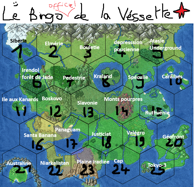 Membre |  Bon, voici mon Bingo. J'ai des doutes sur Pédestrie et Valégro. Mais c'est surtout l'Atasie/underground, je pense que Palla-city sera là bas. ___ Mony clair [ce message a été édité par Mony Clair le 22/09 à 20:14] |