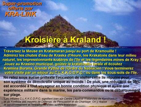 Kraland, terre d'immigration ! Alors que les autres pays se retranchent frileusement derrière leurs frontières, la République Kralandaise est prête à partager son bonheur avec tous ceux qui désirent la rejoindre. Vous vous sentez seul, malheureux, inutile, délaissé ? Remplissez simplement le formulaire adéquat au Bureau d'Immigration, et vous voilà Kralandais ! La propagande ennemie prétend que cet appel à l'immigration est dû au haut taux de mortalité dans l'armée et l'industrie kras, mais ce ne sont évidemment que de vils mensonges.